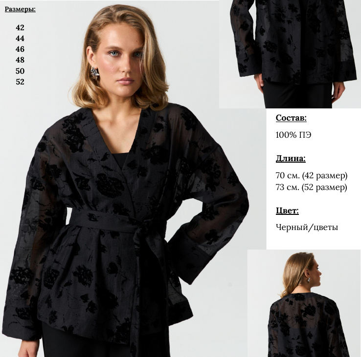 запах. Рукав длинный. Пояс в комплекте. Стильный кардиган с крупным рисунком цветов логично впишется в ваш гардероб и привнесет разнообразие образов,т.к. создаст возможность комбинировать с другими моделями одежды. Его универсальный стиль подойдет на все случаи жизни. С дополнительными аксессуарами он будет выглядеть потрясающе! Этот кардиган из мягкого материала подарит комфорт даже в прохладную погоду. Сочетайте его с юбками, платьями или брюками – универсальность модели позволяет создавать множество модных луков. Яркий принт цветов привлекает внимание и делает образ незабываемым! Завершите лук оригинальными украшениями либо сумочкой – и вы готовы покорять сердца!