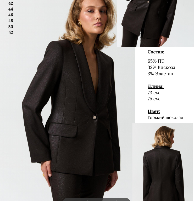 Рукав втачной. Воротник классический шалевый.Застежка на петлю и акцентную пуговицу. Изделие на поливискозном подкладе в тон.Жакет идеально скроенный , созданный для истинных ценителей комфорта и элегантности! Поливискозный подклад гарантирует приятное тепло и легкость в носке. Акцентная пуговица придает изделию особый шарм и индивидуальность. Комплект дополняют изысканные брюки, позволяющие создать стильный и завершенный образ. Такой универсальный ансамбль станет вашим верным спутником в праздничные и будние дни, подчеркивая безупречный вкус и чувство стиля!